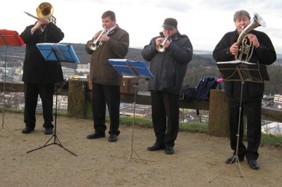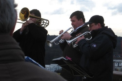 Es scheint hier in Pforzheim doch Traditionen zu geben: die Neujahrsbrezel (Hefegebäck) z.B. Und dann kommen die Bläser aus Sankt Peterbúrg. Und spielen sich die Münder wund. Ich bin mit meiner Nachbarin hin: auf den Wallberg und habe mich gefreut. Einer der Muschiki hat sich dann noch zur Zigeunerweise „Otschi tschornije“ hinreißen lassen, also über die schwarzen Augen gesungen, die er liebt, anbetet und zugleich fürchtet. Hier kennt das Lied wiedermal niemand. Und dann glauben die Leute, bei dem Mann sei eine Sicherung durchgebrannt, wenn er das Ganze mit ziemlicher Inbrunst vorträgt. Der Pfarrer deutete das Gesungene als altslawisches Lied. Trägt alles zur Völkerverständigung bei, nachdem wir alle mit Adolf unser Leid hatten. Der Pfarrer hat den Nachnamen fast vergessen zu nennen.